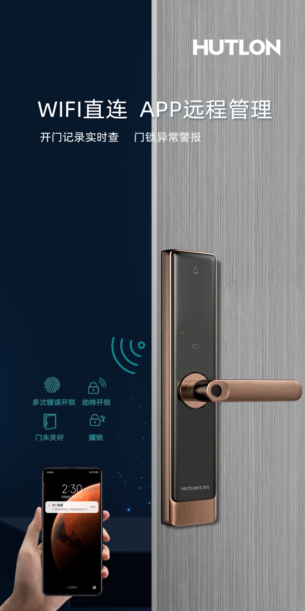 聯(lián)網(wǎng)功能;APP可實時顯示開鎖、報警等信息,可遠程生成臨時密碼開鎖,門鎖用戶管理與設(shè)置等操作,更加安全、人性化與便捷;